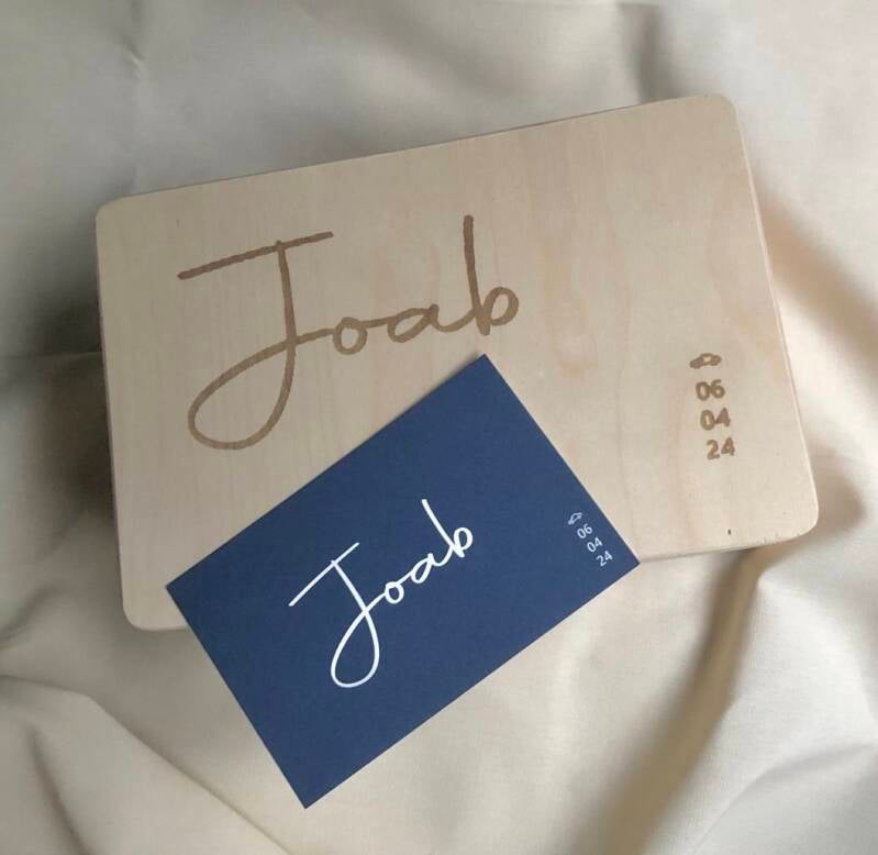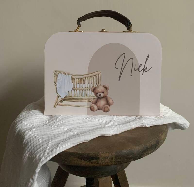 Houten koffertje bedrukt in style van het geboortekaartje. Prijs vanaf €18,95