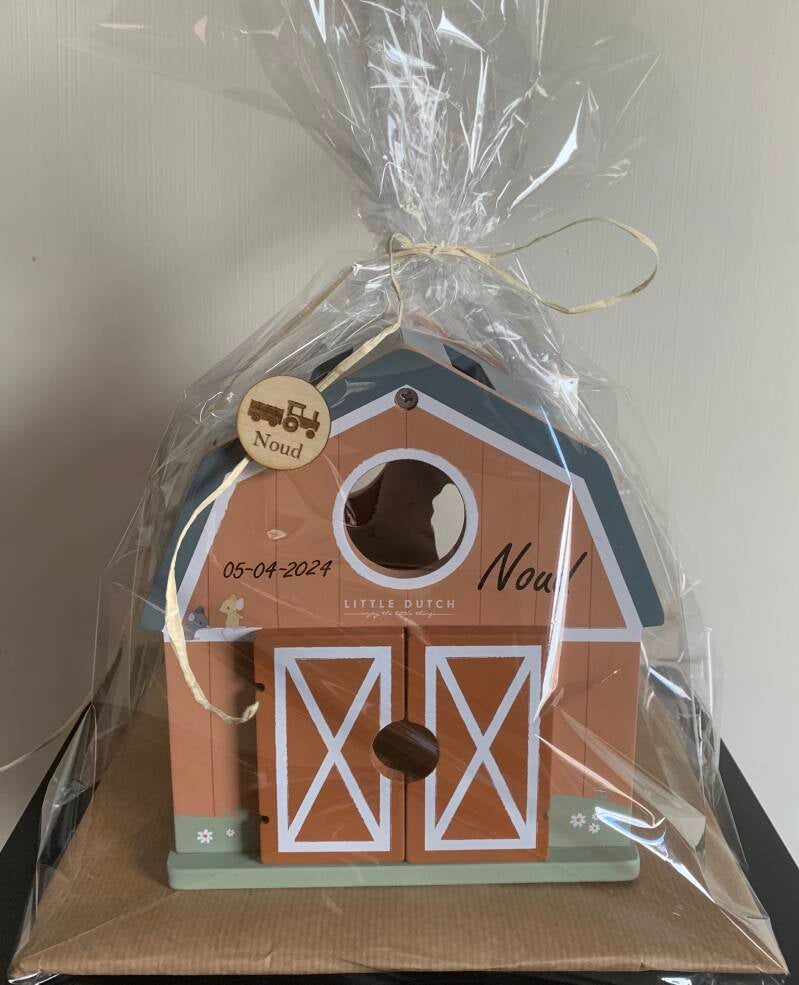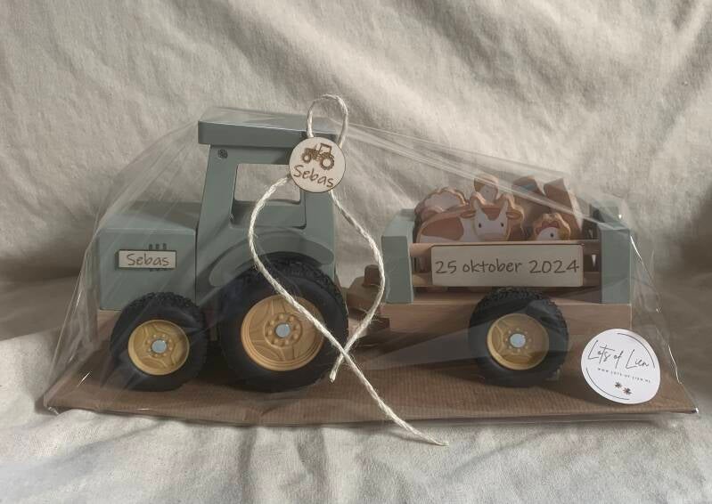 Speelgoed trekker met naam en geboortedatum.