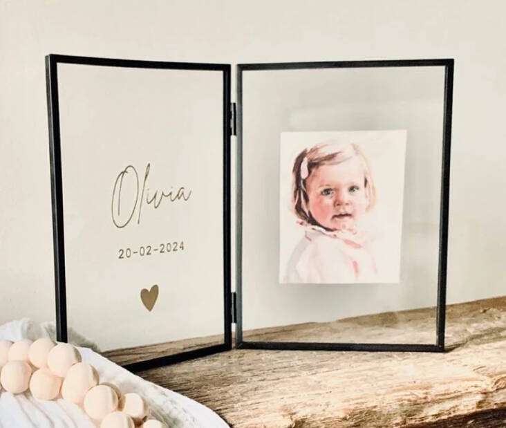 Fotolijst tweeluik met naam. Ook mooi om te gebruiken als herinneringslijstje. Zoals afgebeeld op de foto €16,95 13x18