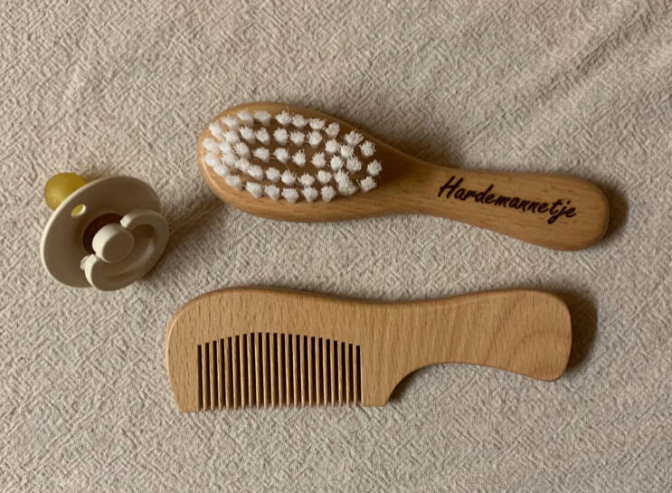 Haarborstel en kam met tekst. Ook leuk om te geven als iemand in blijde verwachting is. Setprijs €12,95 inclusief graveren.