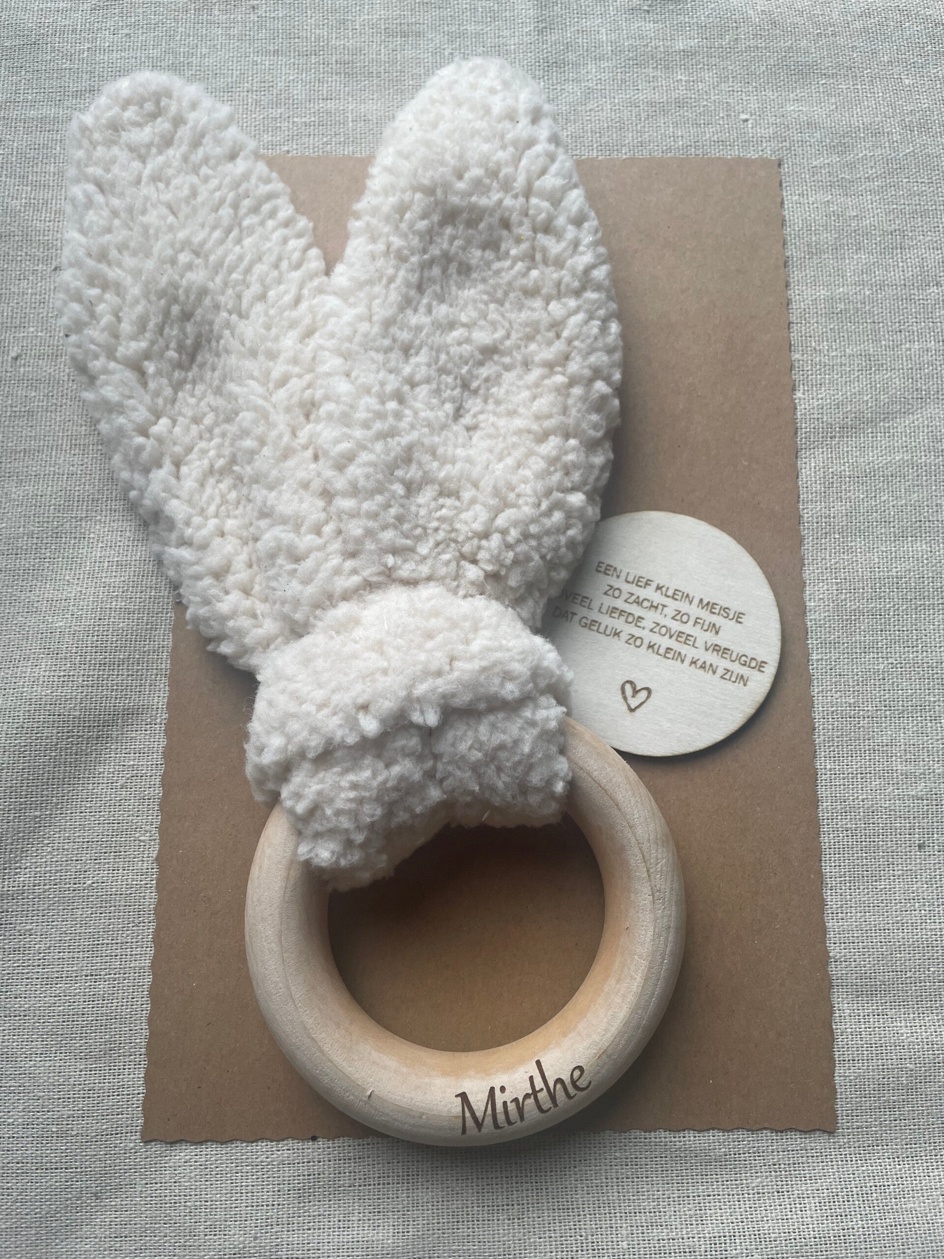 Konijn met naam €8,95. Als extra kan je kaart toevoegen met houten rondje met tekst +€1,50