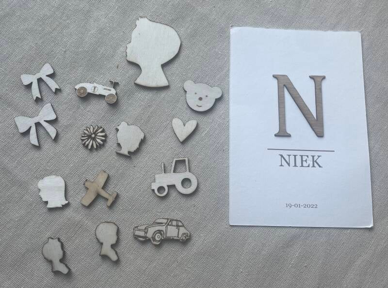 Houten letters of figuurtjes voor op een kaart. Voor meer info stuur een berichtje.