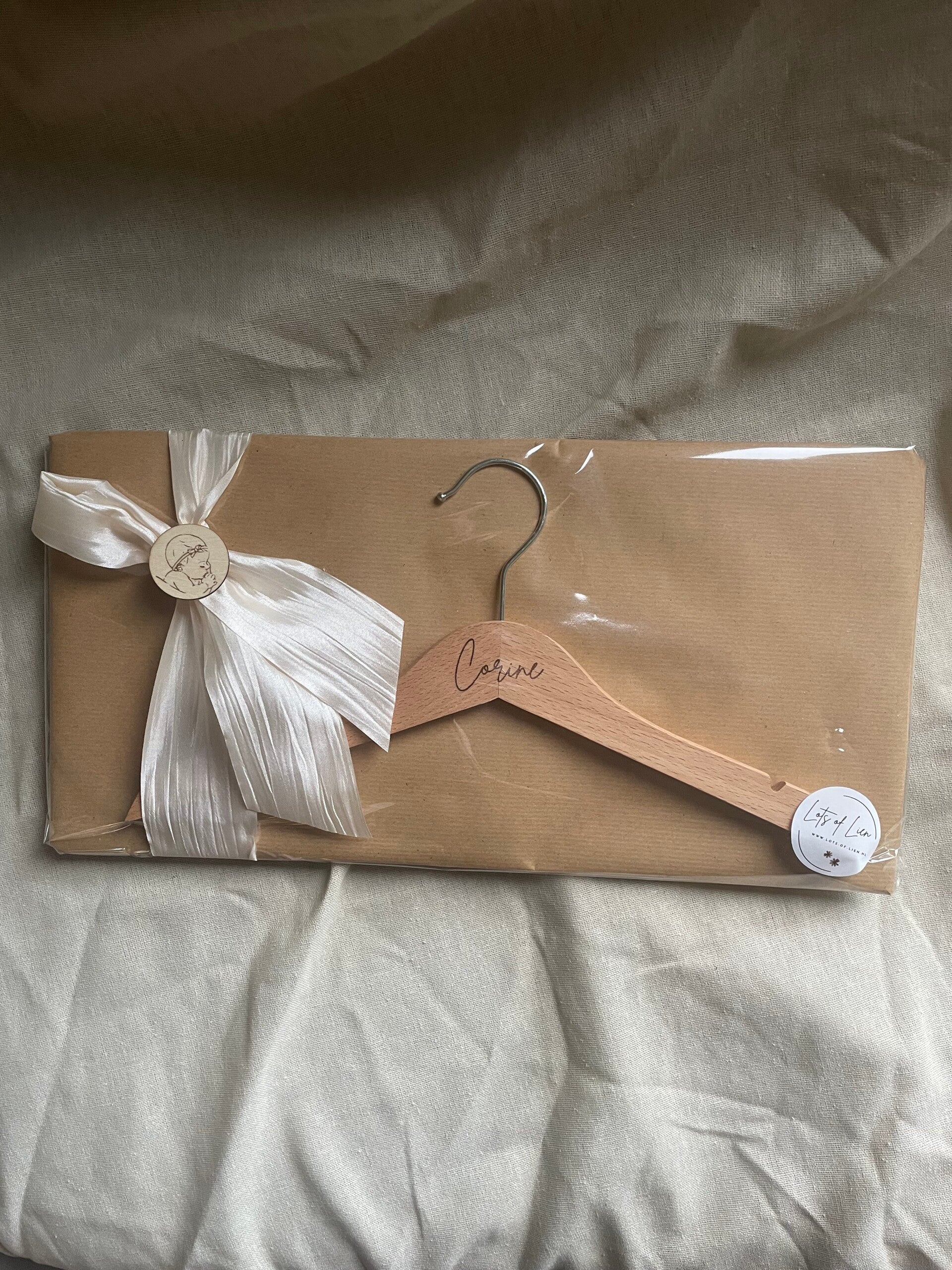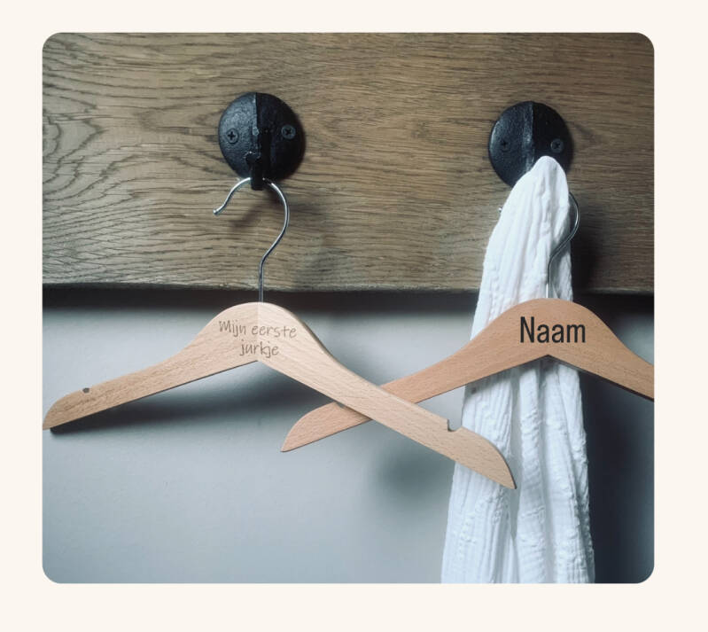 Kledinghanger met tekst zoals afgebeeld €5,95. Met naam €6,95