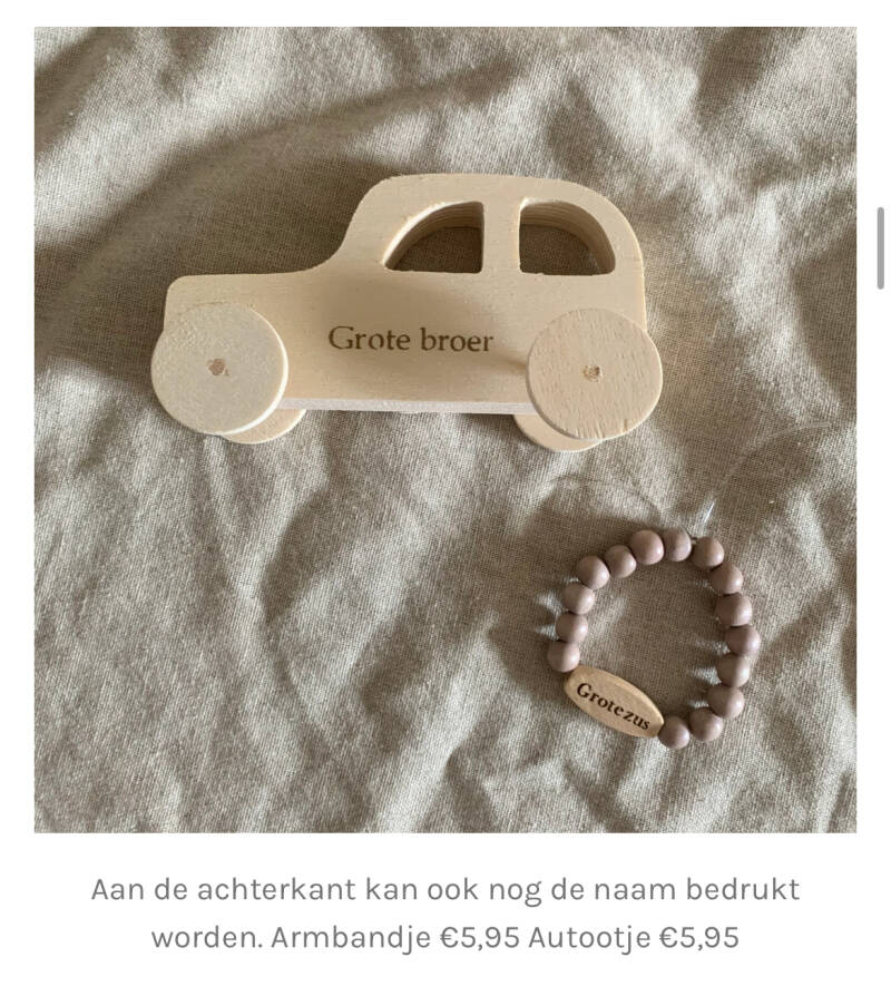 Leuk om te geven aan grote broer of zus. Aan beide kanten te bedrukken en dan kan je aan de andere kant nog de naam doen. Pennen €7,95 Armbandje 2 kanten bedrukt €6,95 1 kant bedrukt €5,95