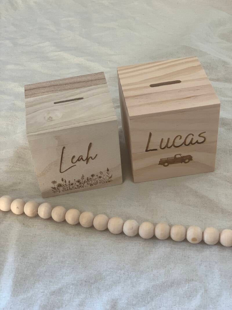 Spaarpot met naam of tekst leverbaar met diverse plaatjes €13,95