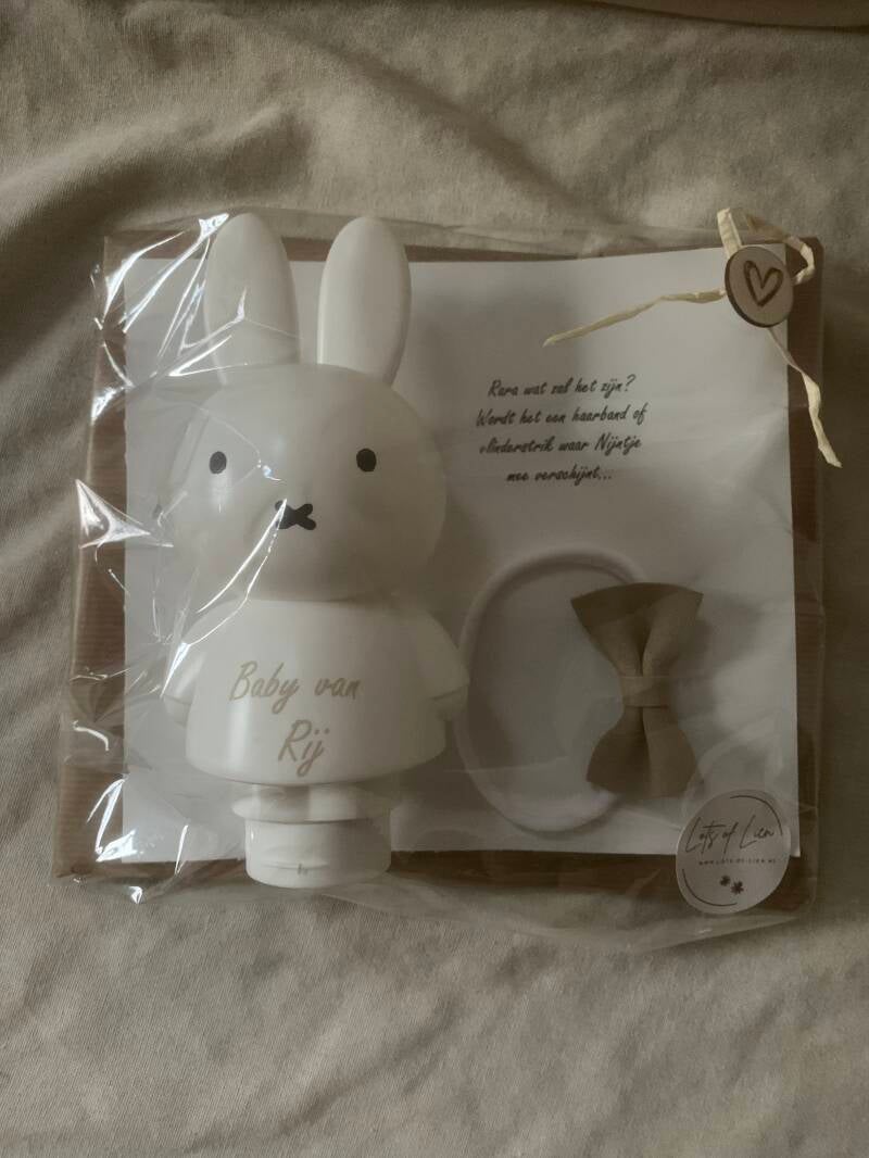 Leuk om een cadeautje te geven tijdens de zwangerschap. En dan helemaal leuk om een persoonlijk cadeautje te geven met naam. Setprijs €12,95 alleen Nijntje met naam €9,95