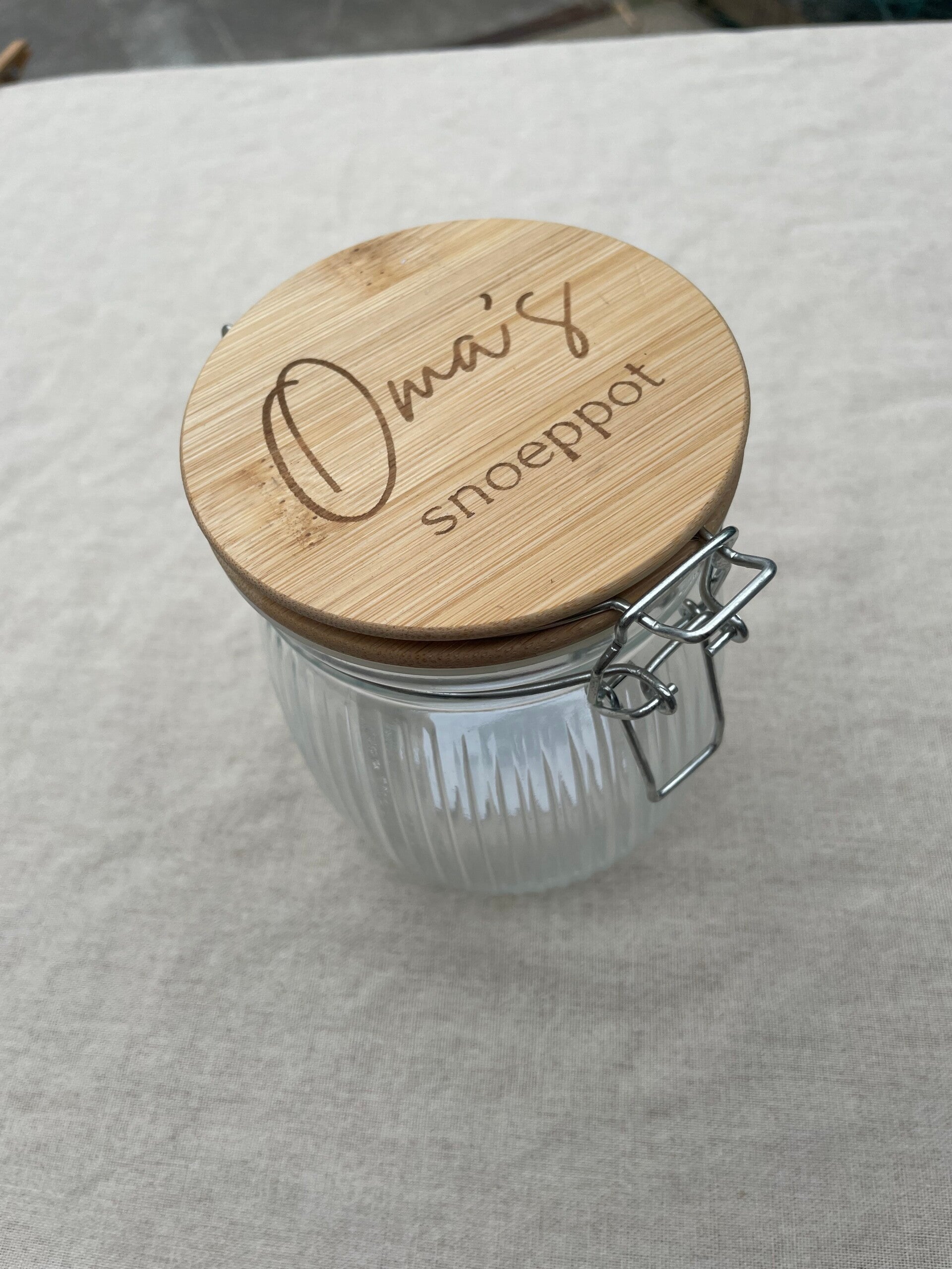 Snoeppotje met tekst per stuk 11cm hoog per stuk €4,95 kan ook met een andere tekst gemaakt worden.